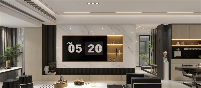 客厅设计拒绝传统单一,采用悬浮柜+半开放柜组合的方式,构建客厅收纳美学。半开放柜可陈列杂志书籍,可展示心爱手办、潮玩,赋予空间N+1的功能,每一处细节都精致熨帖。