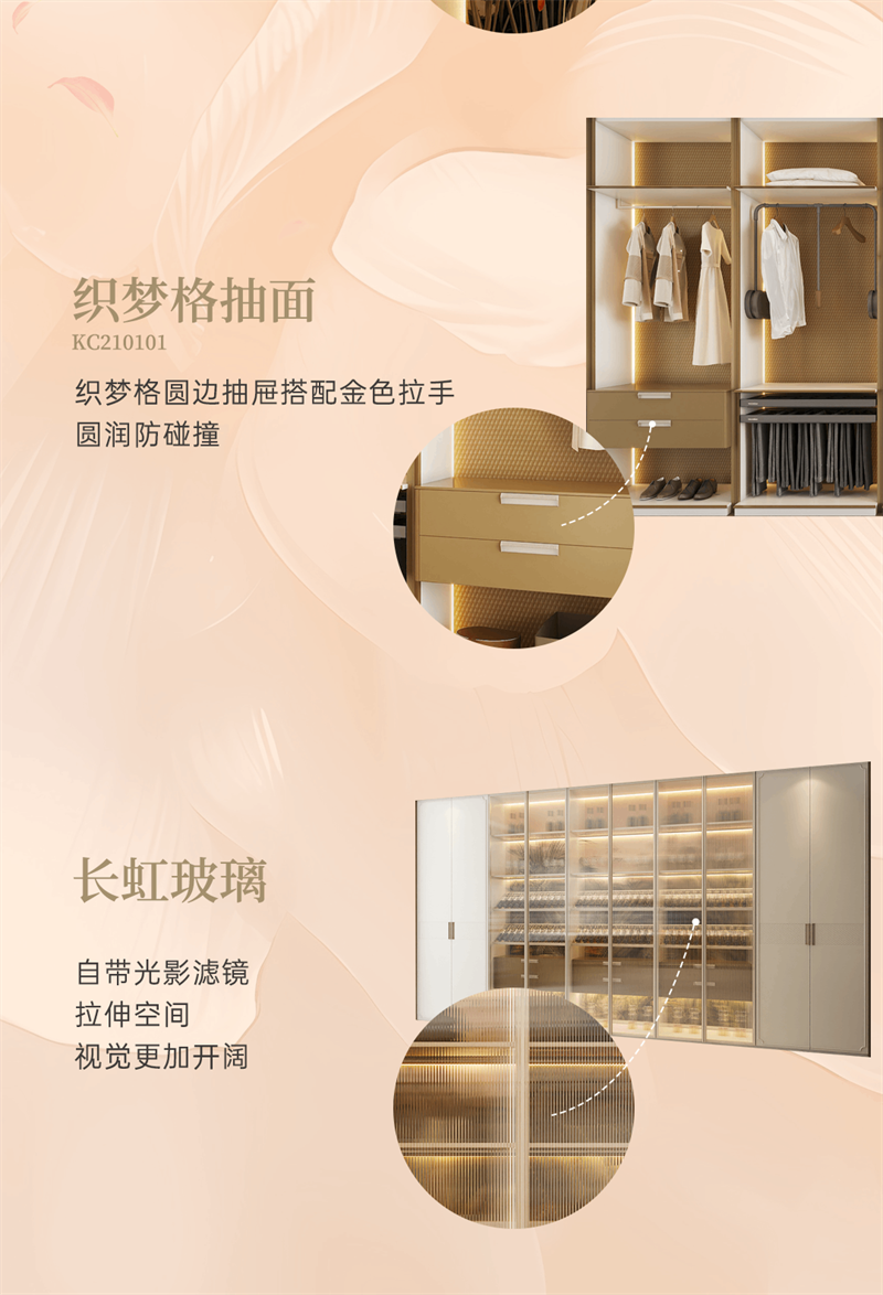 系列产品整体以奶油白和金色元素为空间基调,将法式的气质融入现代空间,以精致细节的融入,让家成为容纳更多想象的美好生活殿堂,让“美”成为一种生活态度。