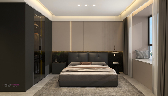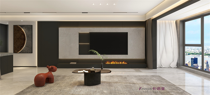 本案业主更注重与家人们的空间情感交流。户型墙体的拆改 使布局流线更顺畅,更锲合业主的需求。玄关客餐厅采用门墙柜一体化设计,化繁为简。鞋柜穿插式设计既有储物功能又有美感。哑光岩板嵌入式电视背景+深色系墙板隐形门,延伸整个空间,壁炉和金属套格更显高级感,沉稳大气。内嵌式酒柜包冰箱管线机,兼具储物、装饰、颜值一体。餐桌岛台做了错位式设计,即贴合了业主的日常家居需求,又与整体空间色系相呼应。卧室无主灯的设计还具备多种情景模式,进一步提升了卧室的氛围体验。
